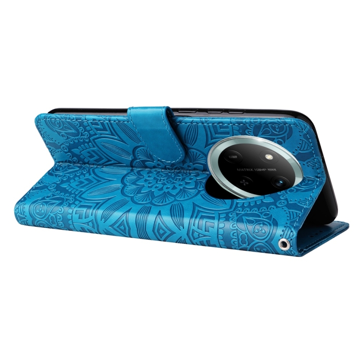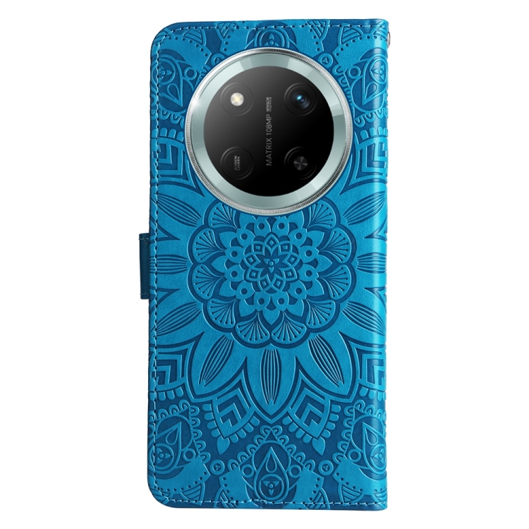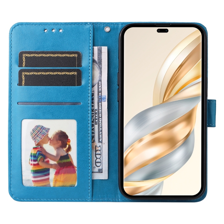 Peněženkové pouzdro Embossing Pattern Slunečnice modré pro mobil Honor Magic 7 Lite s lisovaným vzorem. Toto pevné pouzdro bylo navrženo tak, aby poskytovalo smartphonem ještě lepší ochranu před mechanickým poškozením v důsledku pádů nebo otřesů. Pouzdro má kapsy na dokumenty, do kterých můžete vložit karty a prostor pro bankovky.